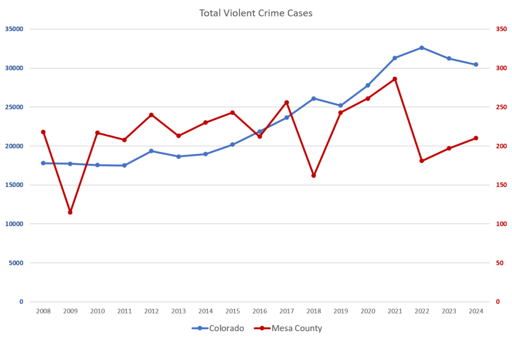 One of the most encouraging parts of the local picture is that law-enforcement reporting shows measurable, long-term progress in important areas. The graph below shows how Mesa County stacks up compared to Colorado on a crime per capita basis.